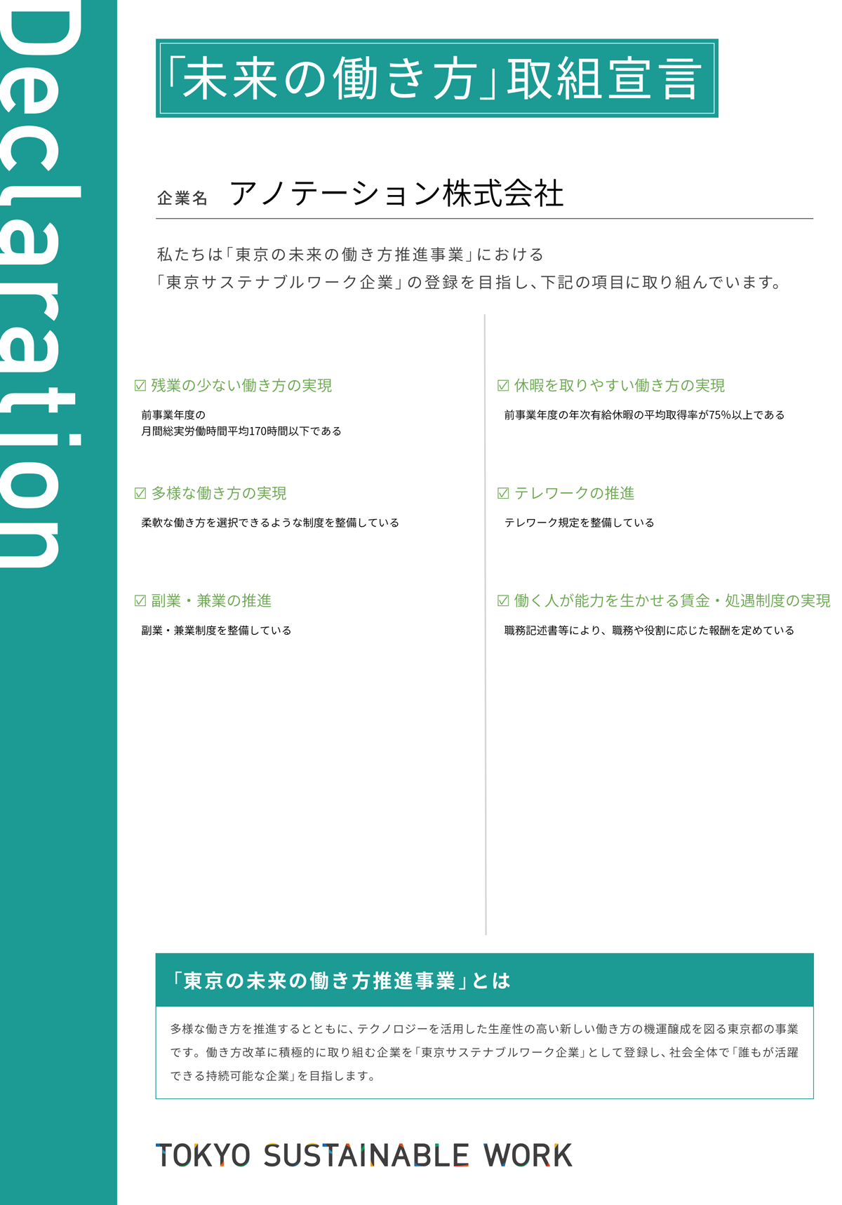 東京都が推進する「未来の働き方」の実現に取り組むことを宣言いたします